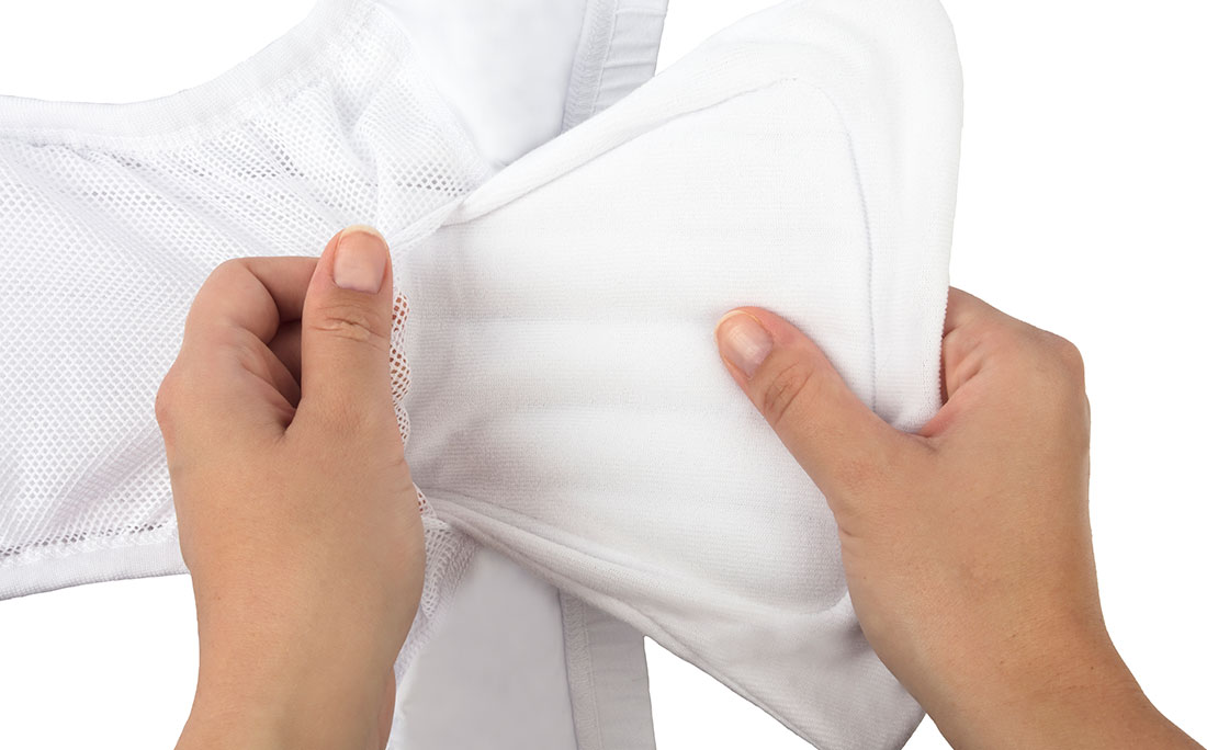 The matching additional, washable insert pads are also available for this model (single, set of 3 and set of 10). These pads absorb up to 150ml and can be inserted quickly and easily in the integral pouch. For maximum comfort, they are specially designed to fit the contours of a woman’s body.